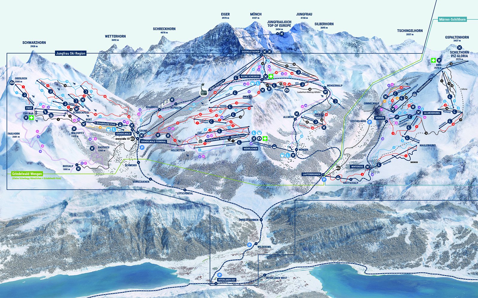 SKimap Murren. La cartina mostra piste e impianti dei comprensori che circondano la Jungfrau. Sulla destra della mappa di vede il paese di Muerren con gli impianti che arrivano fino al Piz Gloria. Espandendo la skimap si notano anche le altre localitò principale della regione sciistica: Wengen e Grindelwald.