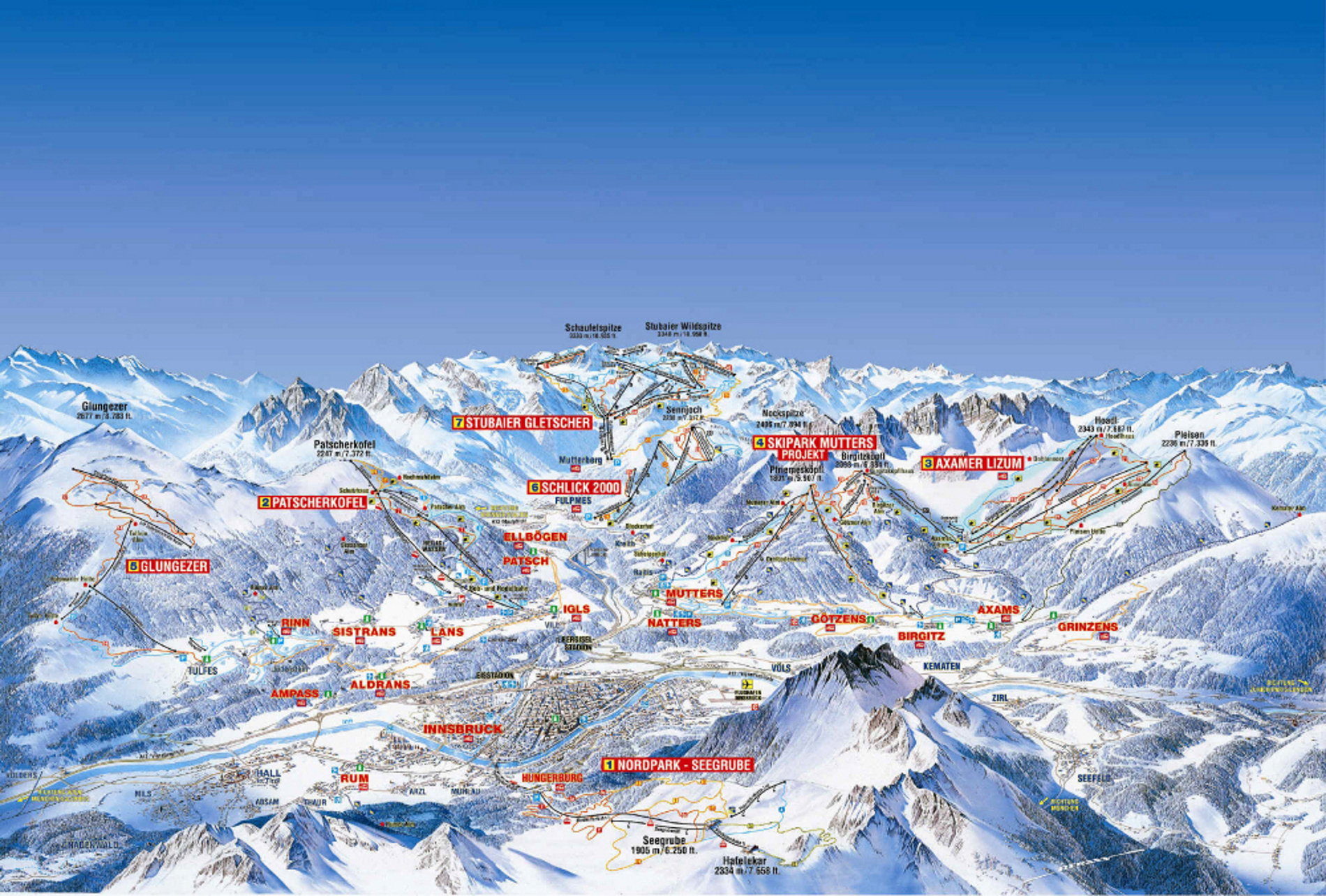 Clicca sulla mappa per ingrandire e guardare la cartina completa delle pisteSkimap Olimpia Skiworld Innsbruck. La cartina mostra la grande regione attorno alla città di Innsbruck con molteplici ski area. Dalla sinistra della mappa vediamo Glungezer, Patscherkogel, Schlick 2000 e nella parte alta della cartina il ghiacciaio di Stubai. Quindi lo Skipark Mutters e Axamer Lizum. Sulla parte bassa della skimap si vede invece la ski area di Nordpark Seebrughe