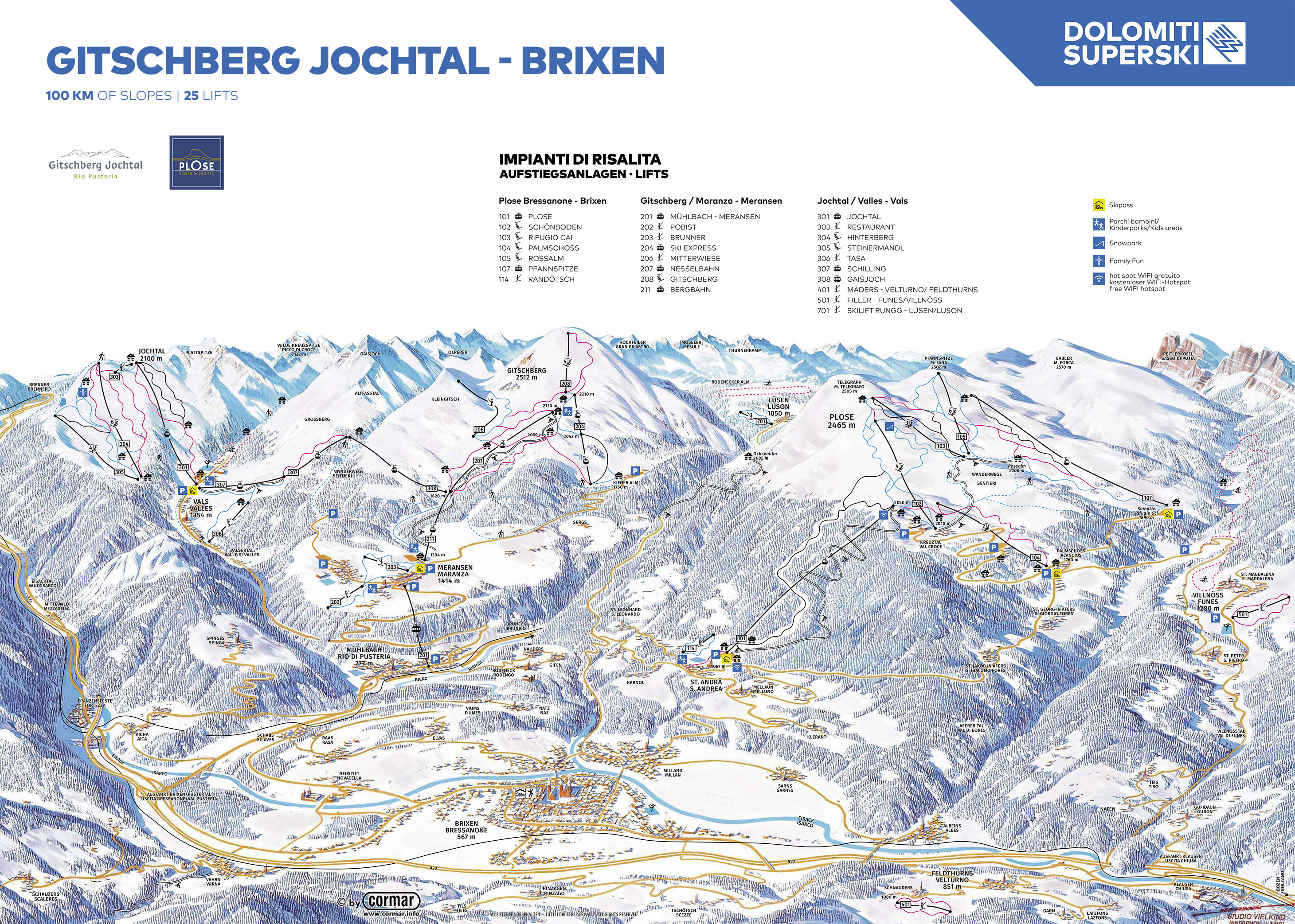 Clicca sulla mappa per ingrandire e guardare la cartina completa delle pisteSkimap Valles Jochtal. La cartina mostra il comprensorio sciistico di Valles che, con Maranza Gitschberg, forma la ski area di Rio Pusteria. La ski area di Valles è quella che si vede sulla sinistra della skimap che è stata collegata alcuni anni fa da una serie di cabinovia Maranza Gitschberg.