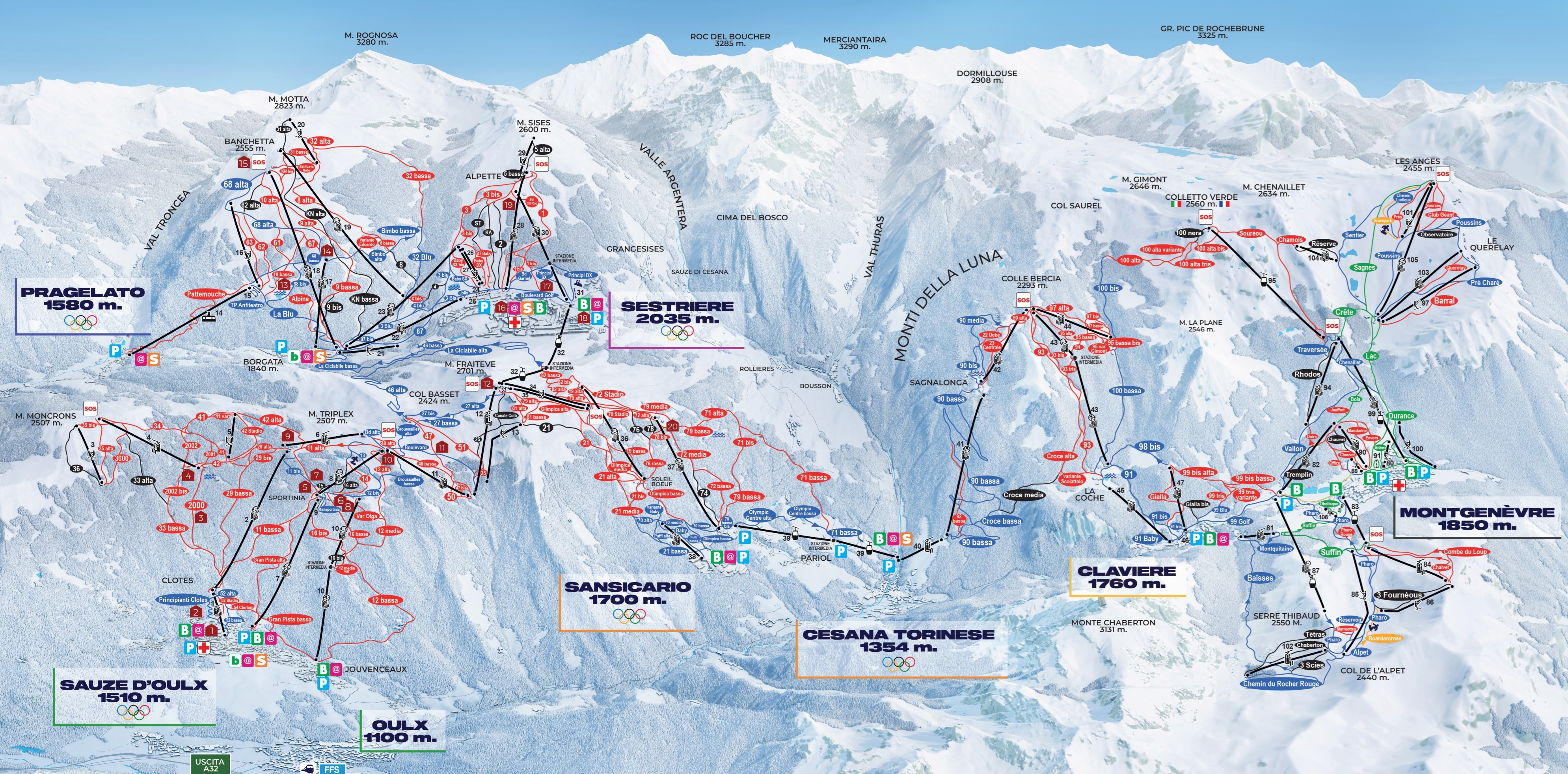 Skimap Vialattea. La cartina mostra piste e impianti del vasto e completo comprensorio della Vialattea. La ski area arriva fino in Francia, a Montgenevre, come si vede sulla parte destra della mappa. Il cuore della Vialattea è la storica località sciistica di Sestriere, al centro della skimap. Da lì si accede sci ai piedi a Pragelato, Sansicario e Sauze d'Oulz (sulla sinistra della cartina). Da Sansicario si accede poi a Cesana, Claviere e quindi a Montgenevre.
