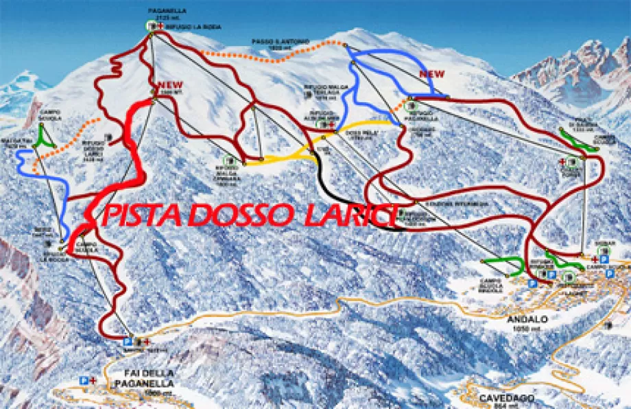 Da Fai della Paganella seggiovia quadriposto Santel _Meritz e poi seggiovia Meritz - La Selletta. La pista inizia alla sinistra della seggiovia. Da Andalo il percorso è solo leggermente più complesso: prendi la telecabina Andalo - Doss de la Pela' sino a monte. A sinistra parte una pista pianeggiante che taglia il costone della montagna, passa sotto la seggiovia quadriposto Albi de Mezz - Cima Paganella, supera la Malga Zambrana - Traliccio e arriva sino alla partenza della seggiovia Malga Zambrana - La Selletta. La pista inizia proprio di fronte alla stazione di arrivo di quest'ultima seggiovia.