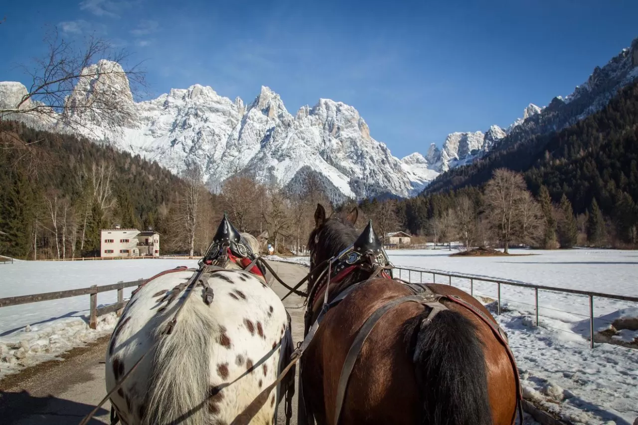 A bordo di una romantica slitta di legno, la tradizionale troika, fatevi trainare dagli splendidi cavalli Noriker alla scoperta della natura della Val Canali lungo il sentiero delle Muse Fedaie godendo dello spettacolo delle Pale di San Martino. Tel. 349 5380090