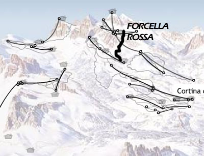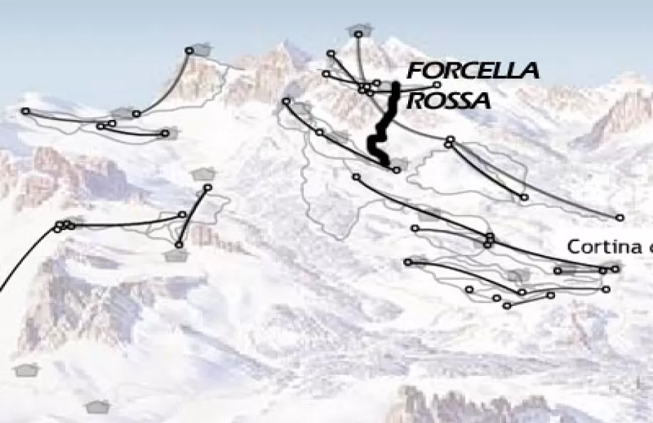 E' la pista Forcella Rossa, la n. 151. Dopo il colle la pista inizia con un muro divertente con alcuni roccioni sul lato destro e una splendida vista sulla valle di Cortina di fronte a te. Dopo poco ti accorgerai di essere in realtà in un imbuto con il muro che si stringe progressivamente sino ad essere chiuso da un imponente roccione. La pista, ormai molto stretta, aggira l'ostacolo sul lato destro puntando decisamente verso destra. La pista si allarga prima per poi stringersi nuovamente in un muro impegnativo seguito, dopo una curva a 90 gradi, da un altro anche più impegnativo, seppure più largo. Finisce così il tratto più complesso della pista che ora punta decisamente verso Rumerlo passando sotto i cavi della funivia Col Drusciè - Ra Valles.