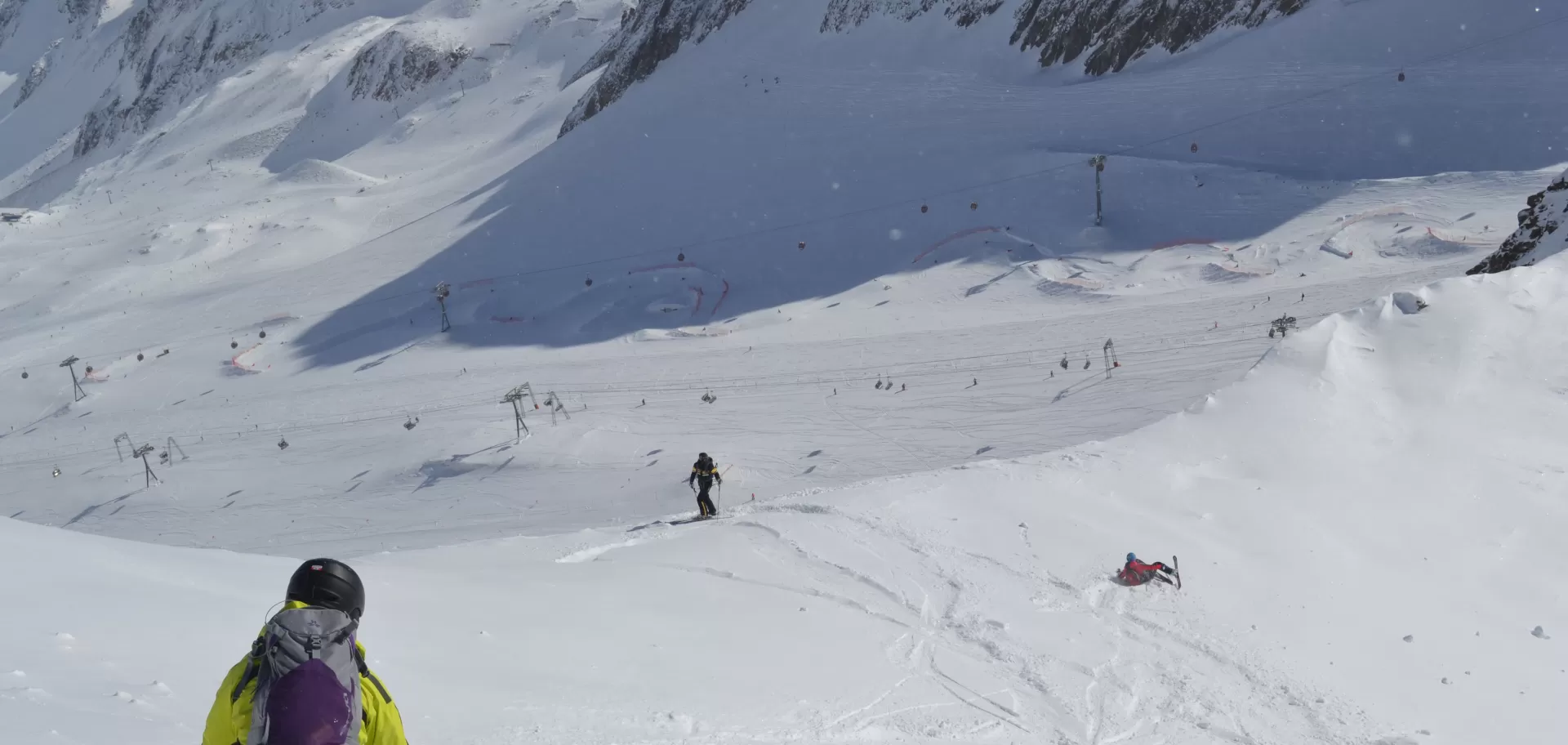 Una serie di linee tratteggiate (ben 9) segnano la skimap di Stubai. Non sono piste battute ma itinerari freeride. Il solo fatto di volerli indicare sulla mappa destinata al pubblico generico di sciatori la dice lunga sulla volontà di avvicinare i propri ospiti alla pratica del freeeride in modo consapevole e sicuro da parte della stazione austriaca.