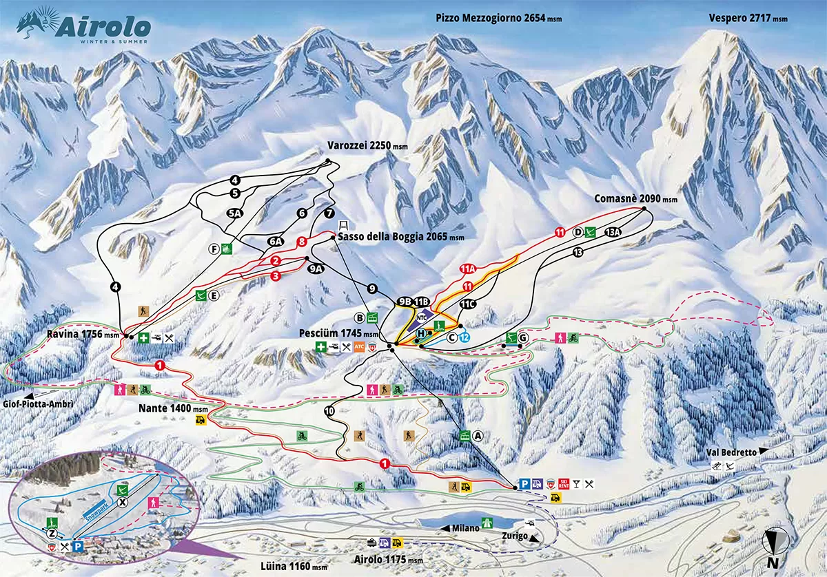 La località vanta 30 km di piste per lo sci alpino adatte a sciatori di medio-alto livello e lo Yukipark per i salti e le evoluzioni degli snowboardisti più esperti. La funivia porta a 1745 m dove ci sono gli altri impianti che conducono fino alla pista Varozzei a 2256 m. Gli sciatori meno esperti ed i bambini possono sciare a Luina, piccola stazione a 2 minuti dall'autostrada; 1 skilift e 2 tapis roulant servono l'area sci- snowboard nel Parco Ricreativo Luina. Le piste sono aperte il mercoledì, il sabato e domenica; il venerdì sera per lo sci notturno. I principianti possono divertirsi anche a Cioss Prato in Val Bedretto, p...