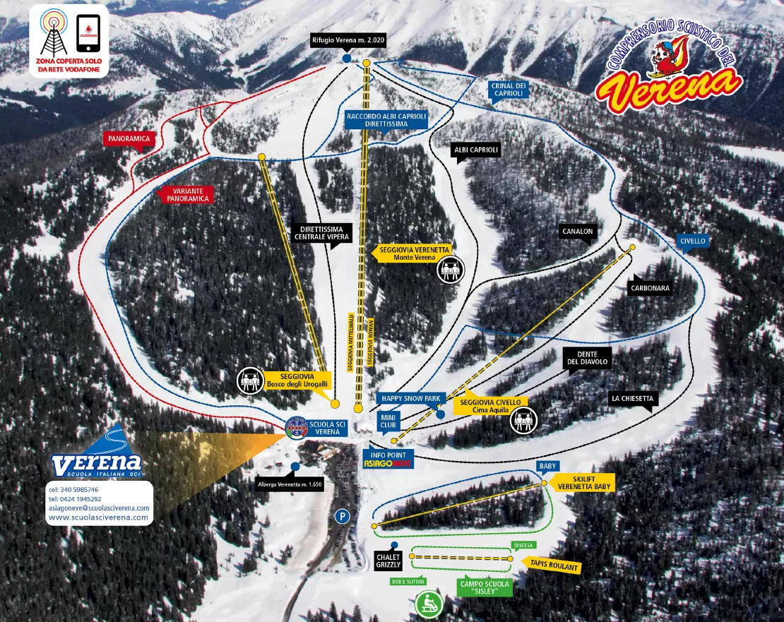La ski area Monte Verena 2000 situata a nord – ovest dell'Altopiano di Asiago 7 Comuni, è il comprensorio sciistico più grande ed elevato di tutto l'Altopiano con 22 km di piste per lo sci alpino.