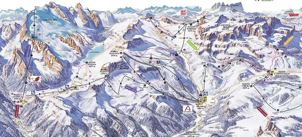 Quanto a Arabba-Marmolada che dire? Località che strizza l'occhio a sciatori esperti. Le piste che scendono da Porta Vescovo sono bellissime, ripide e suggestive, spesso dure e ghiacciate perchè esposte a nord. Quelle verso Passo Campolongo decismante più semplici e più soleggiate. Da non perdere la risalita a Punta Rocca sulla cima della Marmolada: il panorama più bello delle dolomiti è qua. La discesa poi dai 3250m della cima ai 1450m di Malga Ciapela è leggendaria. Per arrivare in fondo servono gambe e fiato, ma è davvero tanta roba. Infine nota particolare per la discesa dal Sass Becè (al confine col Trentino, di là c'è Canazei): la conformazione della pista nella parte alta, fino ad arrivare al Passo Pordoi vi darà la sensazione di infrangere le leggi della fisica. Provare per credere. Fantastica.
