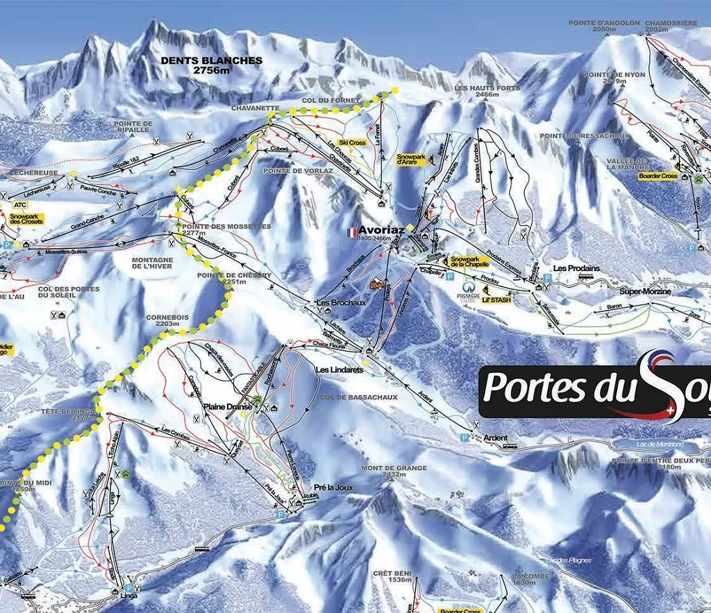 Avoiraz si trova nel cuore del comprensorio Les Portes du Soleil che offre ben 650 km di piste e una portata complessiva degli impianti che supera le 240 mila persone/ora. Dalla località francese si può raggiungere sci ai piedi diverse località svizzere, tra cui Les Crosets, mentre verso la Francia si può facilmente scendere sino a Morzine.