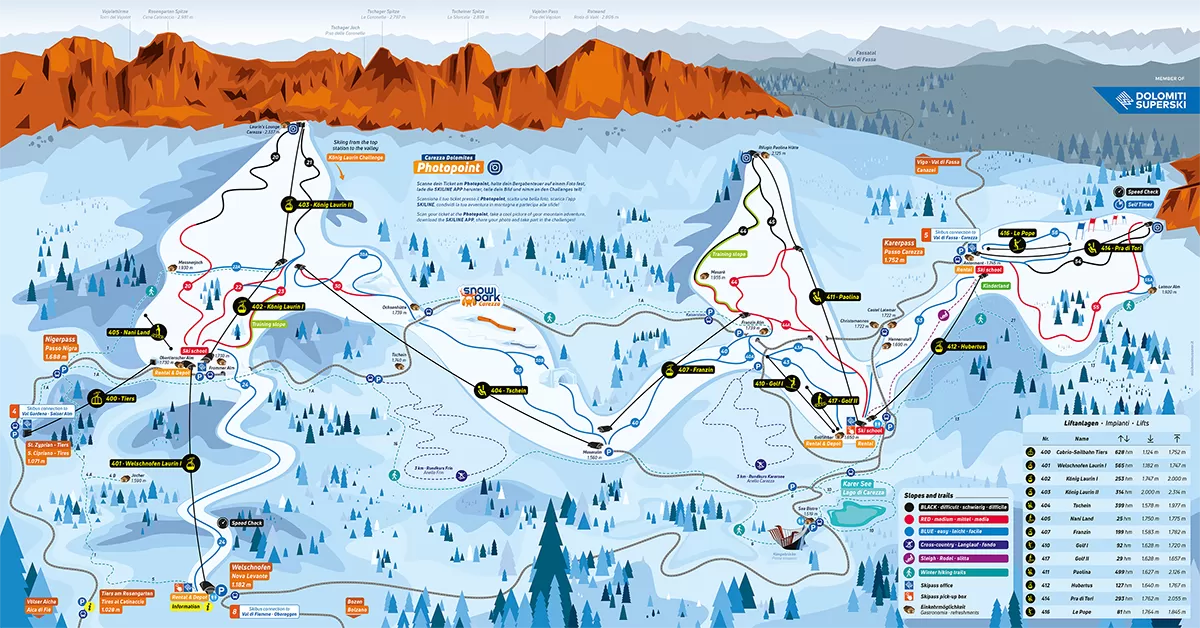 La skiarea Carezza è un comprensorio sciistico che si è recentemente rinnovato, continuando ad attrarre il favore delle famiglie e di chi si vuole avvicinare allo sci per la prima volta intorno alle terre di re Laurino. Una nuova cabinovia a 10 posti, König Laurin, collega l’albergo Frommeralm con il rifugio Fronza alle Coronelle, a 2337 metri di quota. La stazione a monte è completamente interrata nella parete del Catinaccio, confermando ulteriormente un’attenzione particolare all’ambiente.