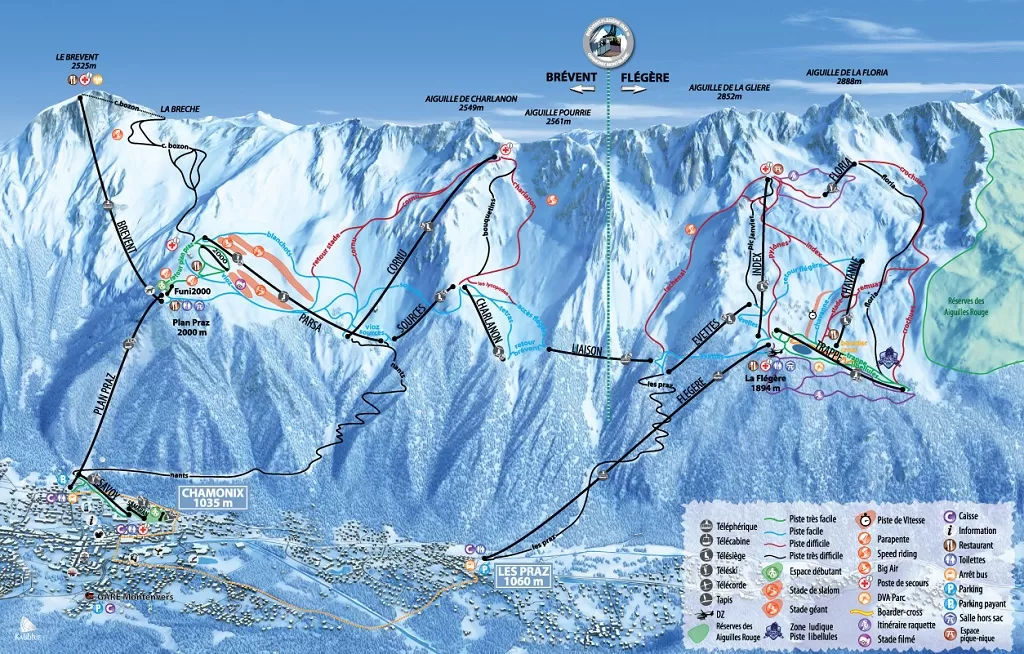 La stazione sciistica di Chamonix si trova subito dopo il tunnel del Monte Bianco, dopo Courmayeur, ma al riparo dal traffico pesante che viene deviato a sud-ovest, lontano dalla città. Vi è la possibilità di sciare sia sul Monte Bianco in itinerari fuori pista, che dall' Aiguille Du Midi scendono sino in paese attraverso la Mer de Glace, sia sul versante opposto, nell'area sciistica Brevent - Flegere. Questo è il comprensorio più ampio della zona con due accessi, uno dal centro di Chamonix e l'altro da Les Praz.