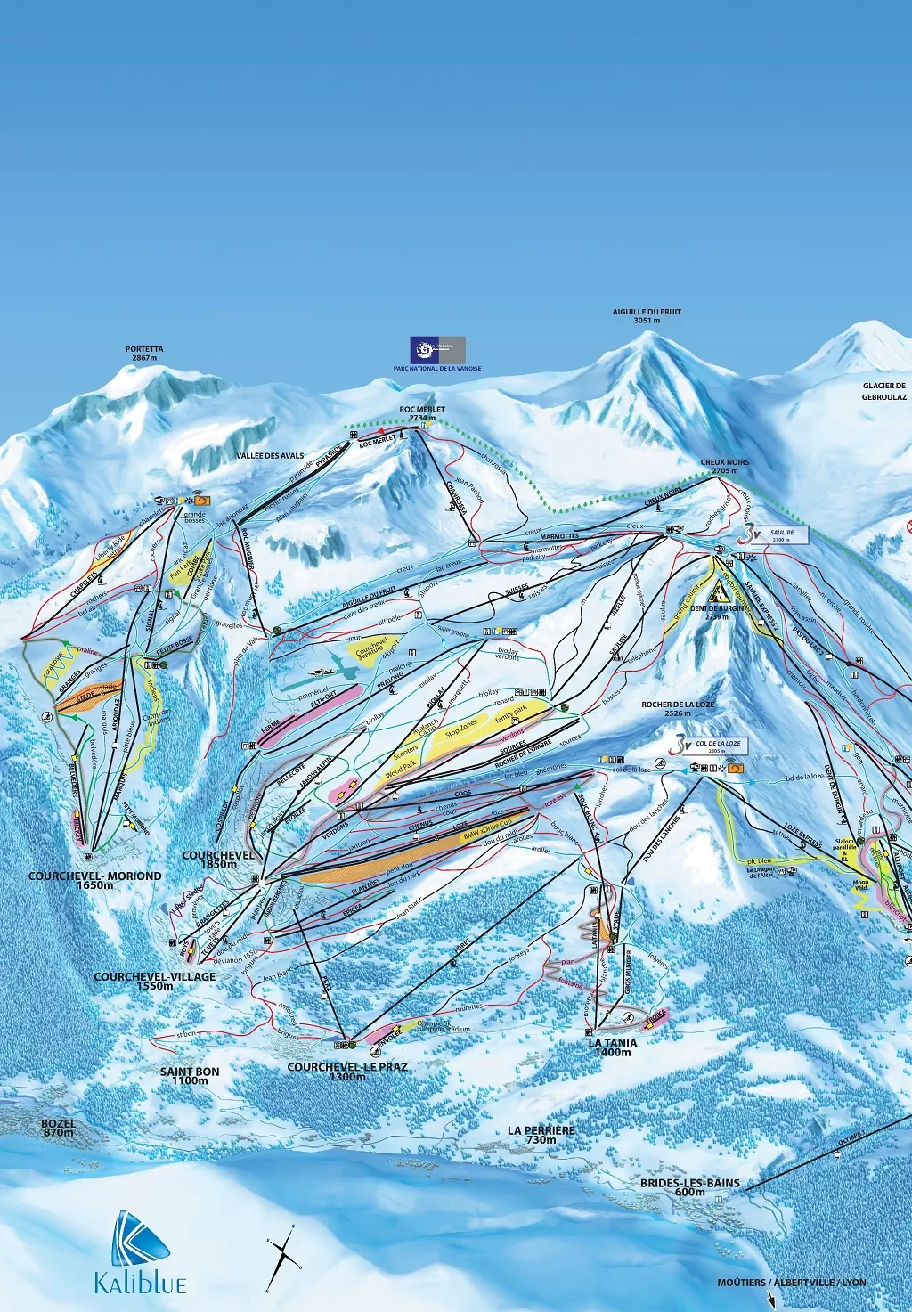 Circondati da massicci e ghiacciai sono 150 i km di piste che diventano 600 in tutto il comprensorio Les Trois Vallées, collegati sci ai piedi. Anche la dotazione di impianti è buona grazie alle numerose telecabine e seggiovie. Il livello medio delle piste non è particolarmente impegnativo; i principianti possono divertirsi sul pianoro di Courchevel 1850, la Plan Mugnier, Montagne Russe, The Piramide. Per i più esperti consigliamo la zona Chanrossa e la Combe Saulire, in particolare la pista nera Grand Couloir di Courchevel, la più ripida d'Europa.
