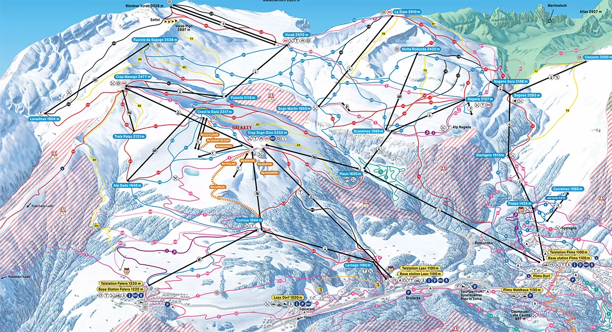 In totale ci sono ben 224 km di piste grazie al collegamento con Laax e Falera con cui costituisce il comprensorio turistico ...