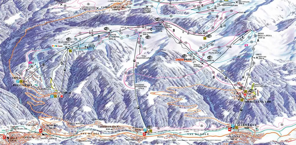 Due telecabine partono rispettivamente da 1300 e 1400 m per portare gli sciatori sino ai 1860 m di Malghet Aut. Tramite il Monte Spolverino si può accedere a Marilleva e da qui alle piste di Madonna di Campiglio e Pinzolo. Per raggiungere Madonna di Campiglio bisogna acquistare l'estensione, mentre l'accesso alle piste di Marilleva è compreso nel prezzo dello skipass ordinario. Molto bella la pista nera che scende dal Monte Spolverino sino a Folgarida, consigliatissima ai più esperti con i suoi 1850 metri di lunghezza e 554 m di dislivello, una larghezza media di circa 35 metri, incuneata nel bosco. 2 sono gli snowparks: lo snowpark Malghet Haut è adatto a chi è agli inizi e si trova alle fine della pista Provetti, poco sopra la partenza della seggiovia Bamby; adatto ai riders con esperienza, lo snowpark Malga Panciana si trova di fianco a Malga Panciana (arrivo della telecabina Copai - Panciana).