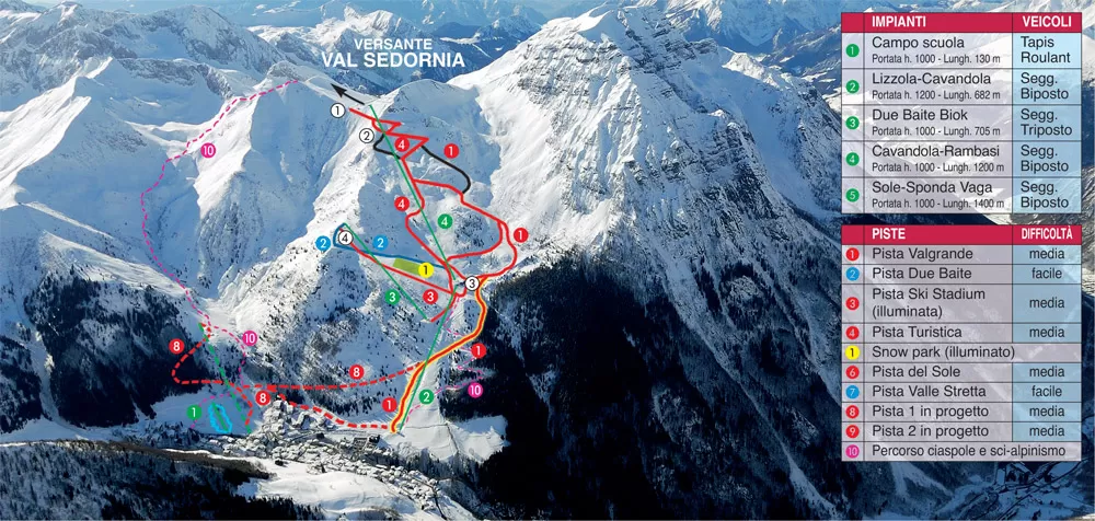 I più piccoli si possono divertire nel baby park dotato di nastro trasportatore e giochi gonfiabili in località Paghera. I più esperti si possono invece sfogare su un buon numero di piste rosse per lo sci alpino che scollinano anche in Val Sedornia, dove la seggiovia Sole - Sponda Vaga rappresenta il primo tassello di un futuro possibile collegamento con Vilminore, Colere e Spiazzi di Gromo. La seggiovia biposto Sole serve la pista rossa Sole che segnaliamo.