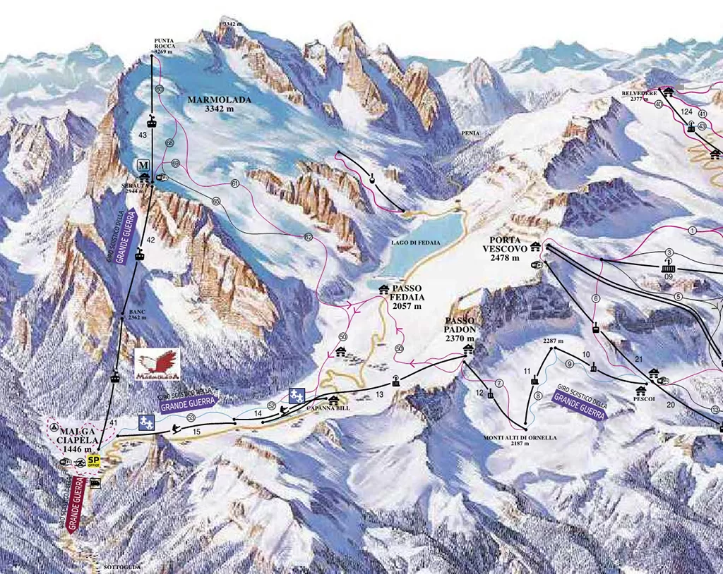 Chi non si vuole avventurare sul ghiacciaio o vuole semplicemente variare piste può superare i 2300 metri del Passo Padon e scendere verso Arabba. Da lì si può accedere al lungo itinerario della Sellaronda. Sulla Marmolada fino a qualche anno fa era anche possibile praticare anche lo sci estivo. Le attuali condizioni non lo permettono più, tuttavia la quota elevata e la qualità della neve rendono la località particolarmente adatta allo sci alpino ad inizio e fine stagione.