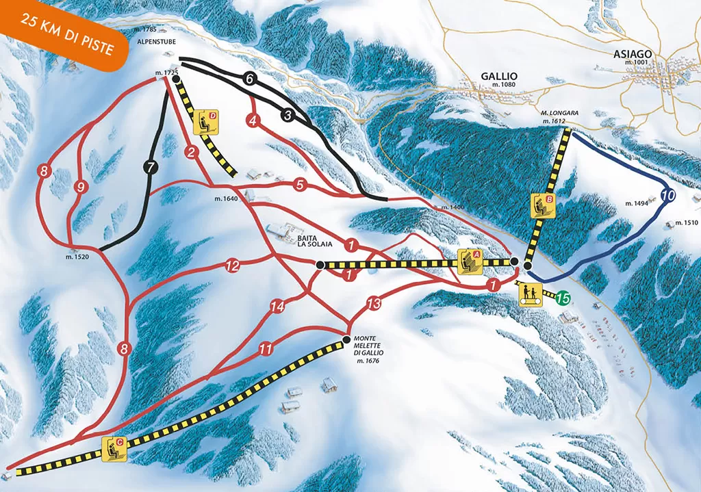 Il comprensorio sciistico di Melette 2000 è adatto ad ogni tipo di sciatore: 17 piste per 25 km per lo sci alpino, di cui 3 piste omologate FISI. Un altro punto a favore della località sciistica è la possibilità di usufruire gratuitamente di un ampio parcheggio vicino agli impianti e dello ski bus gratuito da e per il centro di Asiago.