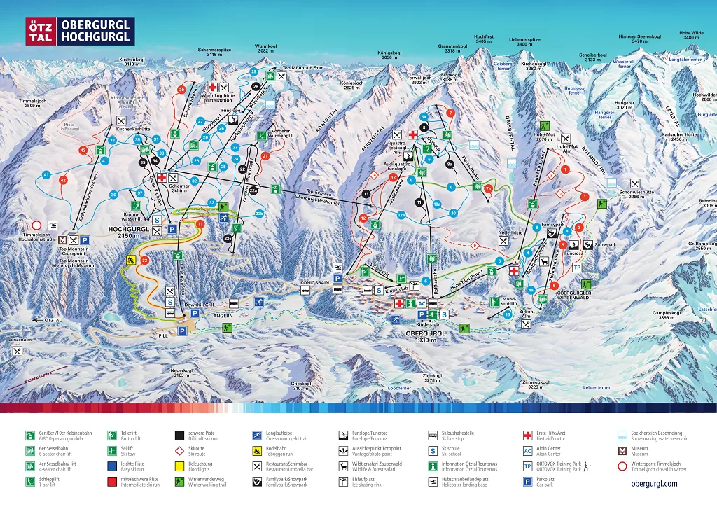 I principianti possono esercitarsi anche a Mahdstuhl. Gli sciatori esperti sciano sulle discese del Festkogl da 3038 m, sui ripidi pendii del Hohe Mut, 2670 m, nel comprensorio di Obergurgl o sui pendii del Wurmkogl, 3082 m e sulla discesa Schermer a Hochgurgl. La pista più lunga è la Wurmkogl - Obergurgl di 8 km per un dislivello di 1.260 metri.