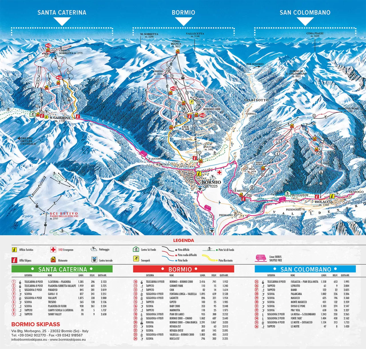 Un unico skipass è valido per i tre comprensori vicini di Cima Piazzi - Oga San Colombano, di Bormio e di Santa Caterina, collegati anche da uno skibus gratuito, anche di notte.