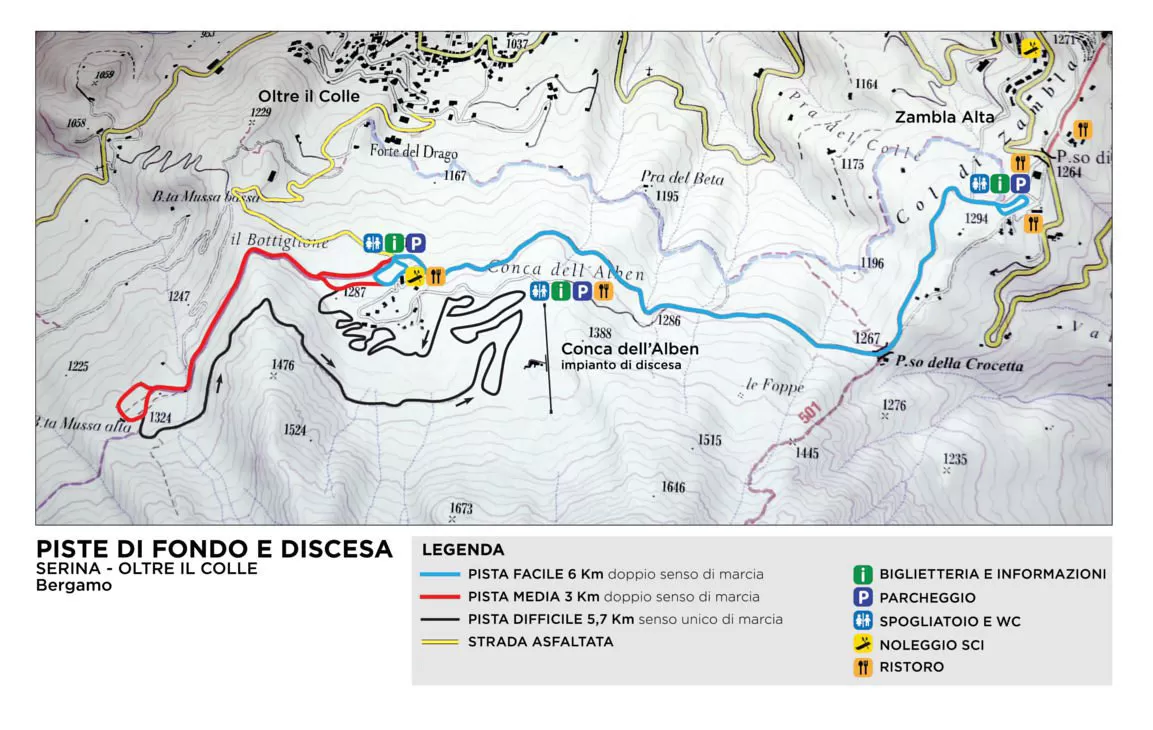 In Alta Val Serina si trova la conca di Oltre il Colle. La vallata è coronata da 4 cime: il Pizzo Arera (2512 m), l'Alben (2019 m), il Grem (2049 m) il Menna (2300 m). Il settore sud-orientale è occupato dal M. Alben e nella sua conca raggiungibile da Oltre il Colle si trovano 2 facili piste di sci alpino con la neve che persiste nella stagione perchè il sole rimane nascosto tutto il periodo invernale. Offre uno skilift nella Conca dell’Alben, da una decina di anni gestito dallo Sci club Val Serina che gestisce anche la pista di fondo. Le due piste da discesa presentano innevamento naturale e programmato. Ci sono rifugi a aperti e scuola sci. Soleggiate invece sono le piste Quistini a Zambla Alta, a sud del Monte Arera, a 1.300 metri di quota, con lo skilift del ristorante Neve. Ha una lunga storia e ora è direttamente gestito dai titolari del vicino ristorante, come servizio ai loro clienti e non solo. La pista è lunga circa 200 metri. Accanto anche un tapis roulant di 50 metri pe...