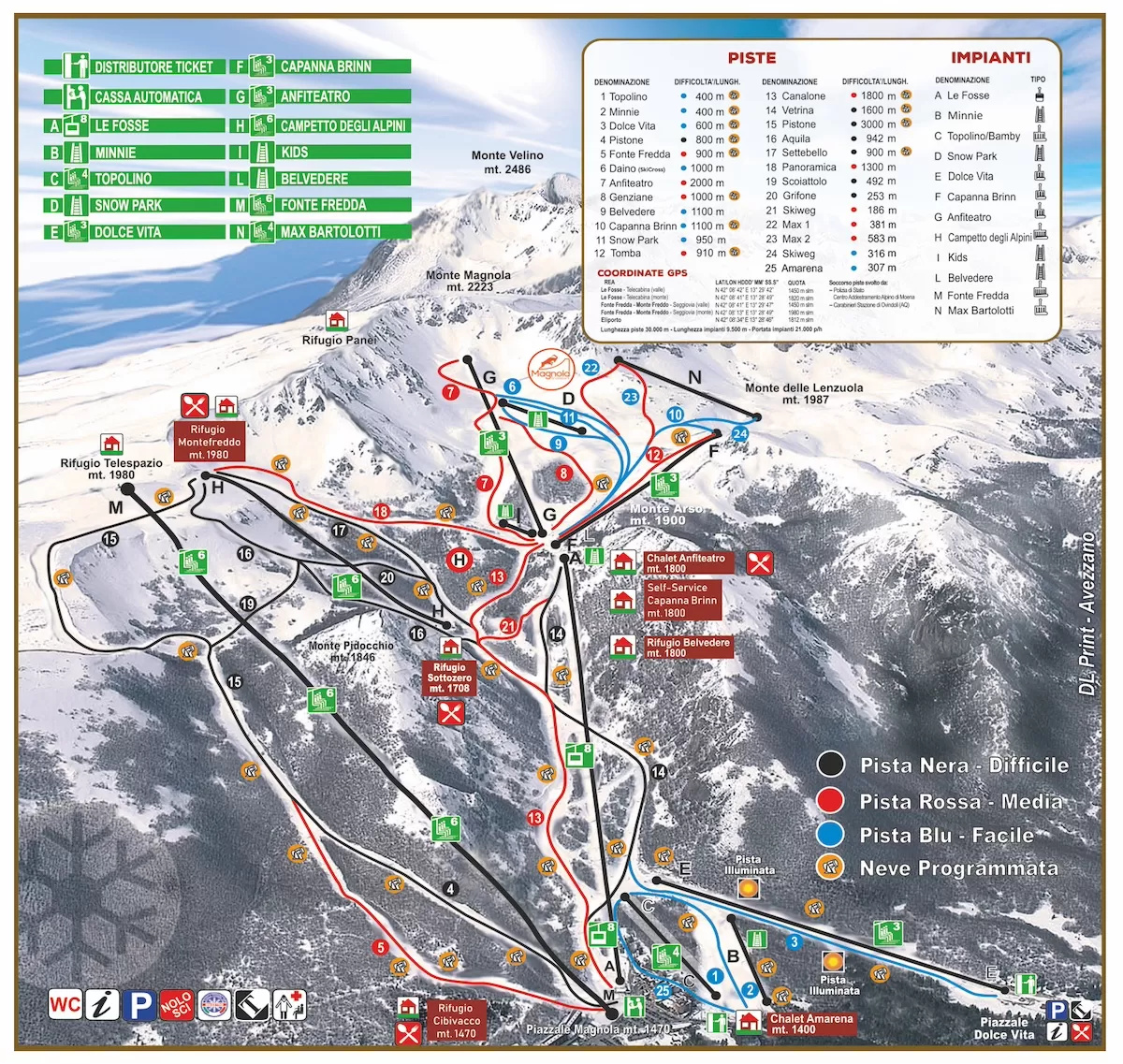 2 sono gli snowpark: il Magnola Upper - Park, storico snowpark della stazione situato a 1980 mt ed il Lower-Park che si trova a 1650 mt lungo la pista Dolce Vita. Quest'ultima pista è illuminata per la notturna come anche la pista blu Topolino. Per lo sci nordico vi sono tracciati nell’altopiano che collega il comune a Rocca di Mezzo e lo stadio del Fondo con anelli di 5 + 3 km.