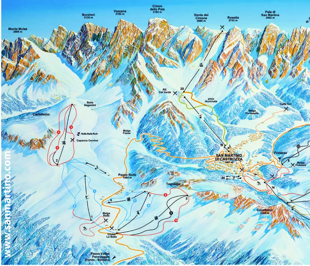 Si scia su neve perfetta e vista su Cimon della Pala e Cima Vezzana, proprio al confine tra la Val di Fiemme e il Primiero tra i 1984 metri di quota del Passo Rolle e i circa 2228 metri dell'arrivo della seggiovia Castellazzo.