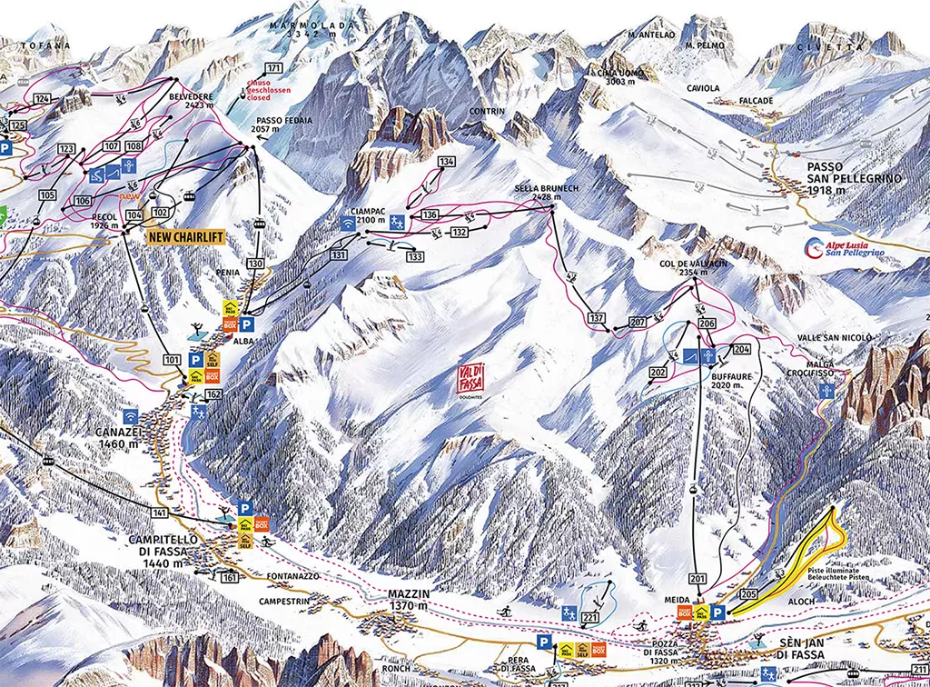 Da Col de Valvacin si scende in Val Jumela per risalire poi a Sella Brunéch. Si finisce sui tracciati della conca del Ciampac e lungo i muri della pista nera di quasi 3 km, che arriva fino ad Alba di Canazei; da qui si può prendere lo skibus che collega con il comprensorio Campitello - Canazei. Si può proseguire inoltre verso il Belvedere, il Col Rodella ed il Sellaronda, nel carosello del Dolomiti Superski.