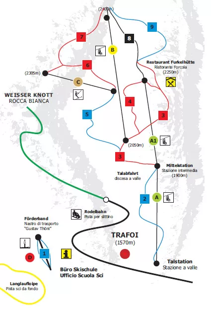 L'area sciistica è piccola, molto bella e soleggiata; è situata al centro del Parco Nazionale dello Stelvio, a 1570 metri, nel Gruppo Ortles. Offre 10 chilometri di piste (2 km facili, 7 km medie, 1 km difficile) con discese a valle da 2750 metri sino direttamente in paese. Una nuova seggiovia Belvedere sostituisce la vecchia sciovia non più in funzione. A Trafoi c'è la più antica scuola di sci italiana dell' Alto Adige. Sul Passo dello Stelvio si pratica lo sci estivo, nonostante i ghiacciai si siano molto ritirati. Aspetti da non sottovalutare: le code agli impianti di risalita non ci sono e quasi tutti gli alberghi sono vicini alla seggiovia, quindi si può uscire dall'albergo con gli scarponi ai piedi. Alternative sono...