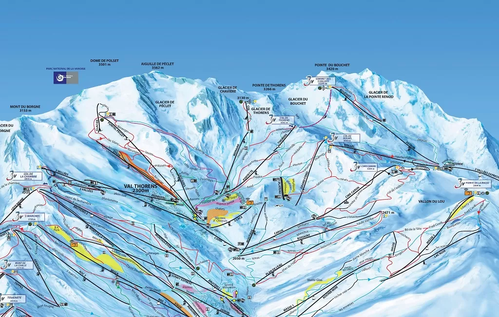 Oltre l'area sciistica della Val Thorens nel comprensorio Les Trois Vallées si trovano: Orelle, St Martin de Belleville, Les Menuires, Brides Les Bains, Méribel, La Tania, Courchevel): 600 km di piste, 328 piste, 166 impianti.