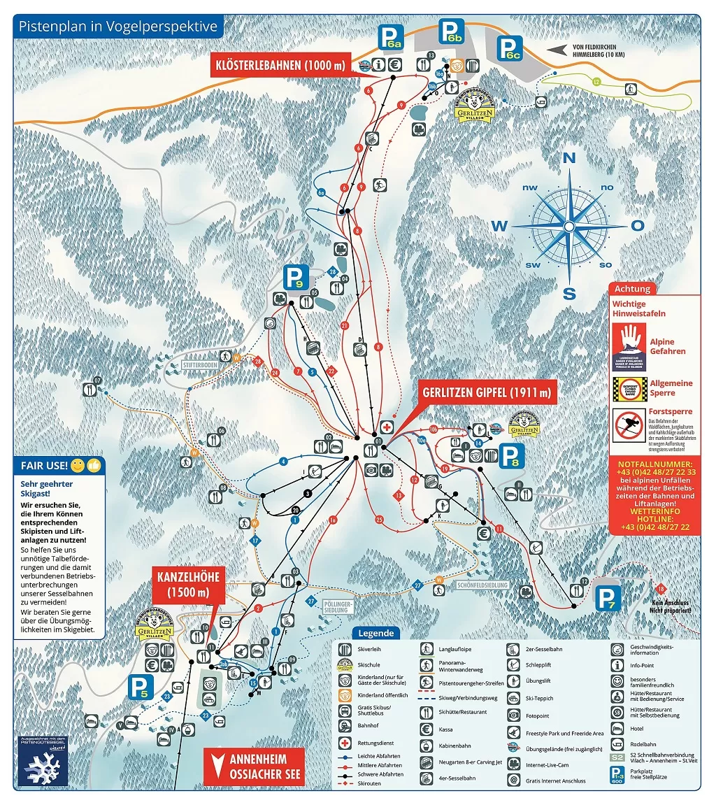 L'area di Gerlitzen si sviluppa dai 1000 ai 1911 m, servita da 1 cabinovia, 7 seggiovie, 3 sciovie e 4 campi scuola. I 51 km di piste larghe invitano a divertirsi con gli sci carving o con lo snowboard. Ci sono inoltre delle offerte speciali, come lo sconto del 50% per il bagno termale Warmbad per tutti coloro che hanno una tessera sciistica della regione, anche quella giornaliera.