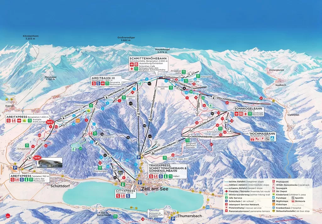 L'area sul Monte Maiskogel è adatta alle famiglie con piccoli. Kaprun sta di fronte al ghiacciaio Kitzsteinhorn dove si può sciare 10 mesi all'anno; sulle sue nevi si trova lo snowpark Kitzsteinhorn con 4 diversi parchi neve per differenti livelli di difficoltà. Suo vanto è il cosiddetto "tubo super", che è il più grande tubo in Austria (135 m di lunghezza e 6,3 di altezza). I principianti possono mostrare il loro talento nel "Parco Easy", mentre il "Central Park" è per i più esperti.
