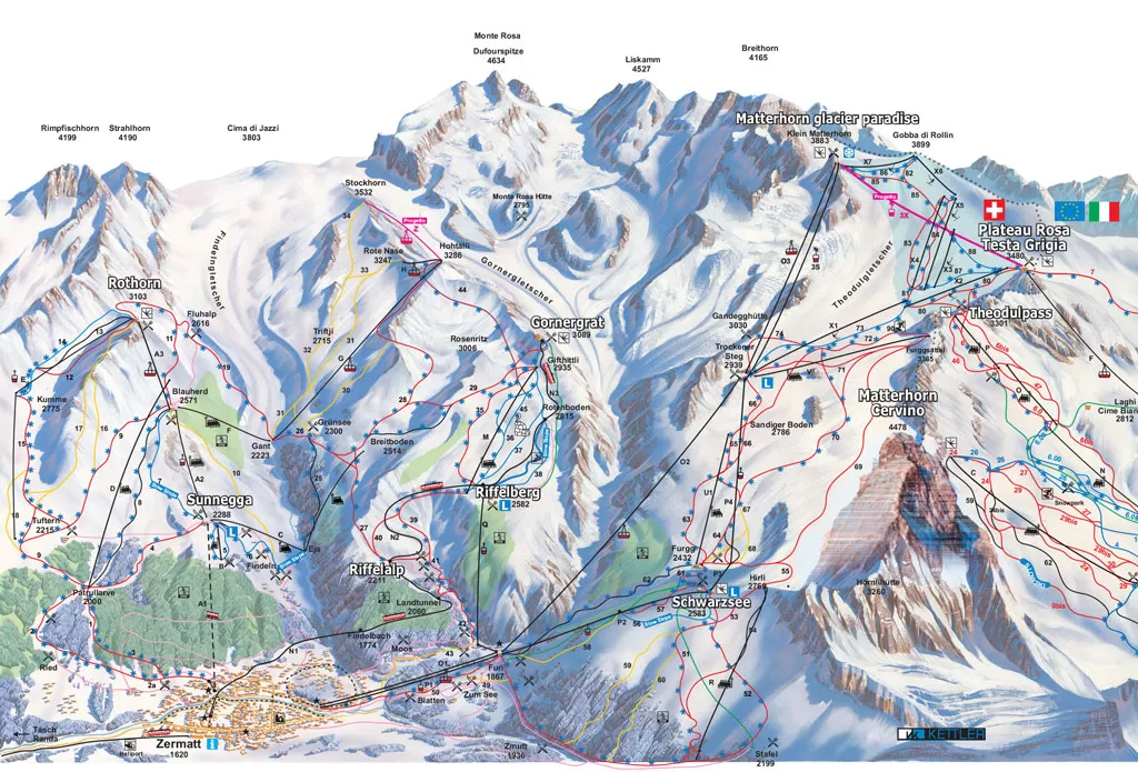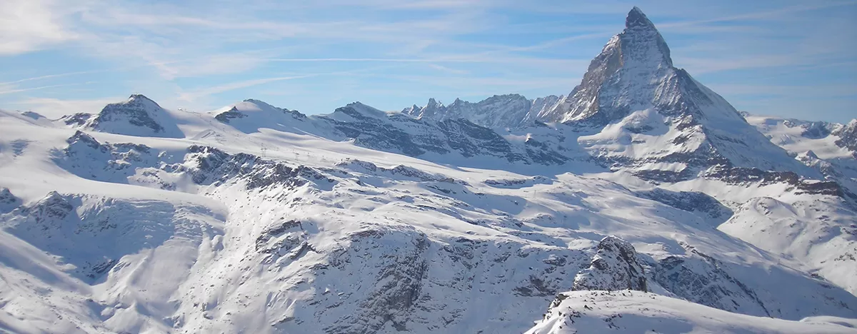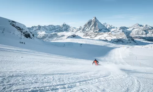 Zermatt è una delle più note e celebrate ski area internazionali situata ai piedi del Cervino (Matterhorn in tedesco) sul versante Svizzero. E' adagiata in fondo alla Valle Mattertal e vi si arriva solo col treno; in paese circolano solo veicoli elettrici. E' una tra le poche località sciistiche senza auto. Un'attenzione all'ambiente che si rileva anche nell'approccio inedito per gli impianti di risalita (certificati ISO 14001) e nell'autosufficienza energetica dei ristoranti in quota, data dagli impianti fotovoltaici e dai pannelli solari.