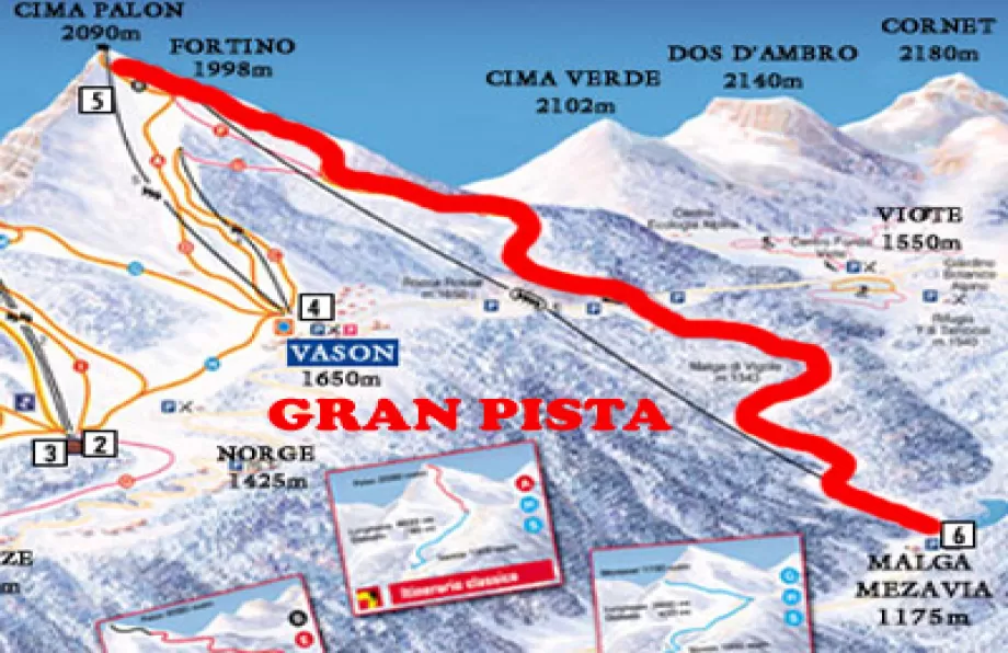 Da Vason occorre prendere la seggiovia triposto Palon che porta in cima all'omonimo monte, proprio sopra l'arrivo della seggiovia Rocce Rosse. Tieni la sinistra e le indicazioni ti porteranno all'inizio della pista