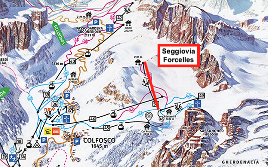 La seggiovia si trova nel demanio sciabile di Colfosco e serve una pista rossa particolarmente divertente e il rifugio Forcelles. La stazione a valle sarà a 1818 metri di quota e quella a monte a 2122.