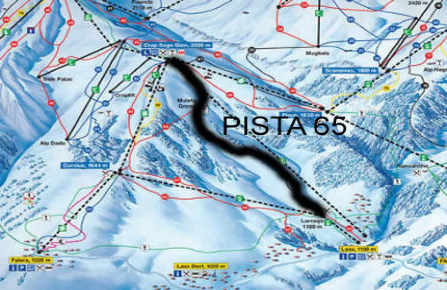 La pista 65 di Laax, detta anche Crap Sogn Gion - Laax Murschetg per le zone che collega, è probabilmente la più difficile dell'intero comprensorio di Flims - Laax. Quasi interamente immersa nel bosco, la 65 inizia a 2200 metri di quota staccandosi dalla 66 che dal comprensorio di Laax si dirige verso Plaun.