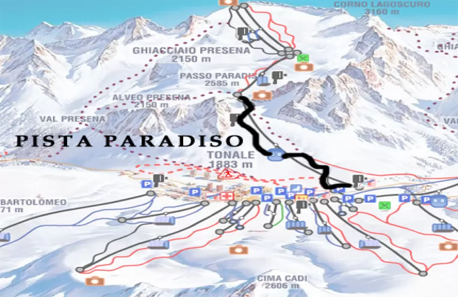 La Paradiso è una pista emozionante e veloce collocata sul lato destro della montagna salendo dal versante lombardo del Passo del Tonale, sotto l’omonima telecabina e poco più a valle del ghiacciaio Presena. L’innevamento è generalmente molto buono grazie alla scarsissima esposizione al sole e grazie all’ottimo innevamento artificiale. Il primo tratto è stato recentemente allargato e presenta subito un tornante tra alti roccioni. La pista taglia verso sinistra e poi verso destra subito dopo il tornante. Curva verso sinistra ed ecco un lunghissimo muro dove ci si può divertire alla grande. La pendenza è discreta e costante, con la neve generalmente in ottimo stato. Qui puoi lasciar correre gli sci perchè di solito la pista non è troppo affollata. Stai andando troppo veloce, il muro, anche se lungo, è quasi finito e con esso la parte più interessante della pista. Poi una S verso sinistra ti immette su un muro più tranquillo. Un’ultima curva verso destra chiude anche questo muro e ti immette in un lungo falsopiano con tanto di ponte sulla strada. Pochi metri ancora ed eccoti arrivato. Soddisfatto?