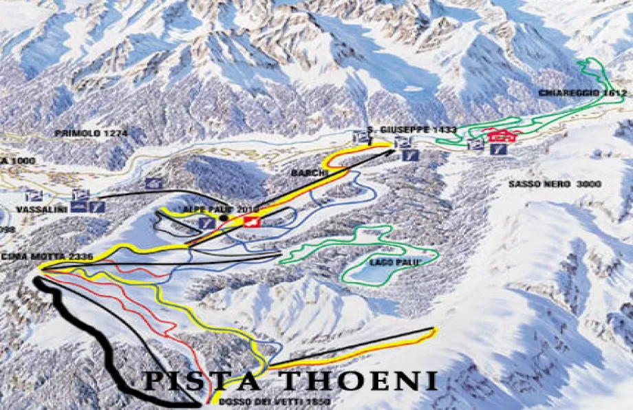 Dall'Alpe Palù (dove arriva la funivia da Chiesa Valmalenco) si prende la seggiovia per Cima Motta. La pista parte alla sinistra della seggiovia quadriposto Dosso dei Vetti che sale dall'altro versante