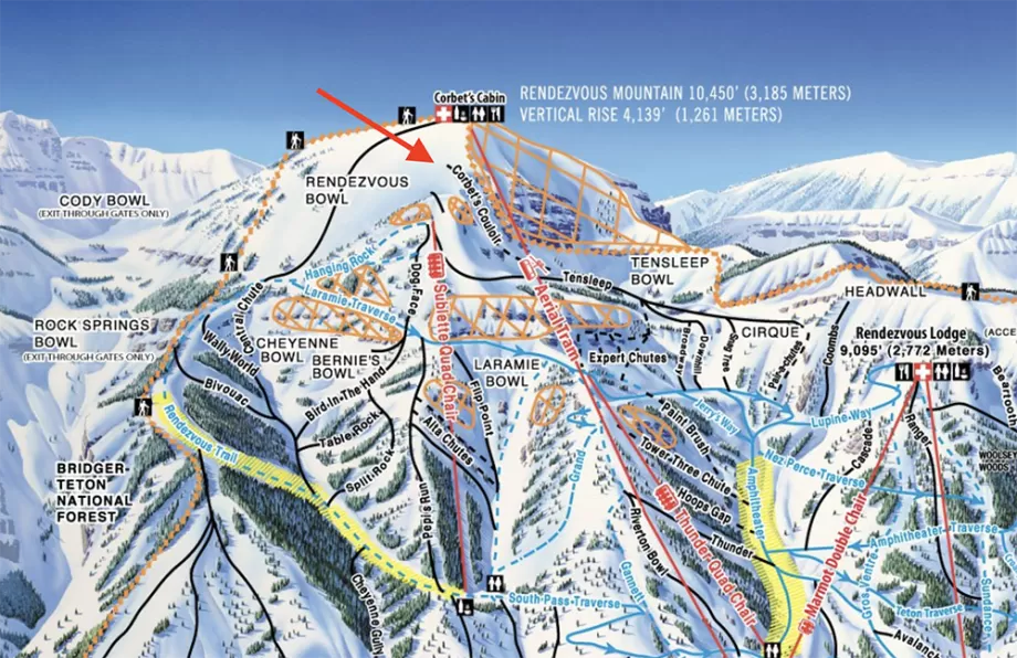 Il Corbet's Couloir inizia con un salto verticale tra i 3 e i 6 metri, a seconda delle condizioni di innevamento, a cui si accede da una cornice. Noto per essere una delle piste più "spaventose" d'America, questo itinerario non è battuto e solitamente è sempre molto carico di neve vista la conformazione a canale dove le precipitazioni si accumulano al riparo dal vento.