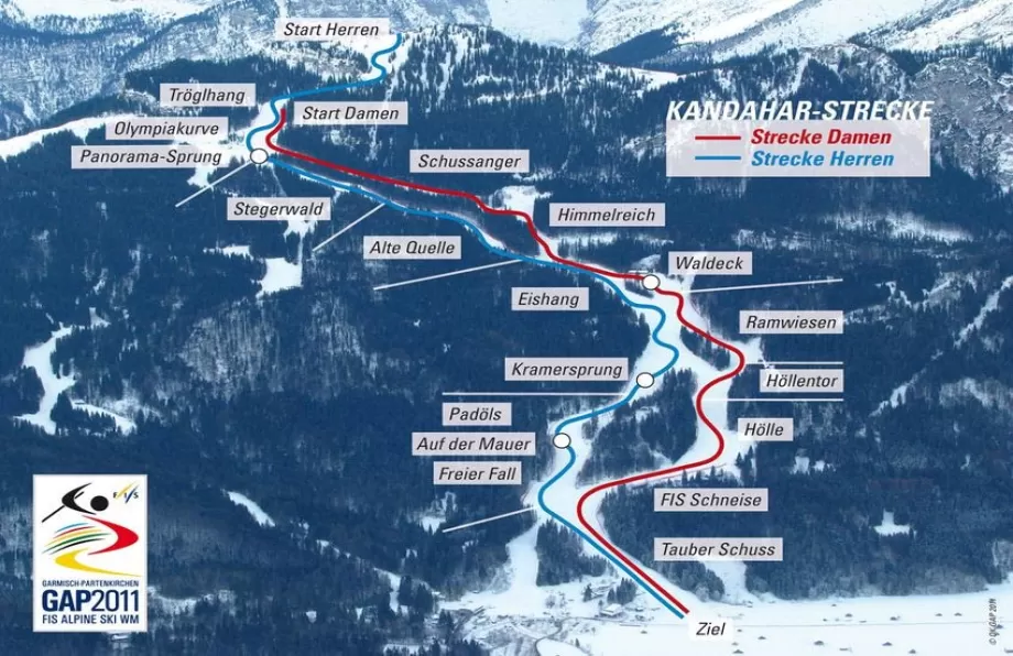 E' una pista storica: i Giochi Olimpici Invernali si sono svolti qui nel lontano 1936. Una tappa della Coppa del Mondo di sci alpino vi si svolge ogni anno dal 1970 ed ospita i migliori discesisti che si misurano su questo tracciato gareggiando con velocità ben superiori ai 100 km/h per raggiungere il traguardo. L'italiano Christof Innerhofer nel 2011 fece la tripletta con una medaglia d' oro nel supergigante (video sotto), una d' argento nella supercombinata e l' ultima di bronzo nella discesa libera.