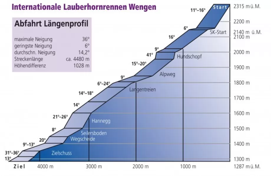 La pista del Lauberhorn a Wengen con i suoi 4,480 km è la discesa di Coppa del Mondo più lunga e impegnativa. E' velocissima: gli atleti raggiungono velocità record, fino a 160 km/h nell'Haneggschuss. Ogni anno a metà gennaio i campioni percorrono la discesa del Lauberhorn che raggiunge una pendenza massima del 72 % in circa due minuti e mezzo! Durante la stagione sciistica anche gli sciatori amatoriali esperti possono percorrerla concedendosi di ammirare il panorama strepitoso dell'Eiger, Monch e Jugfrau.