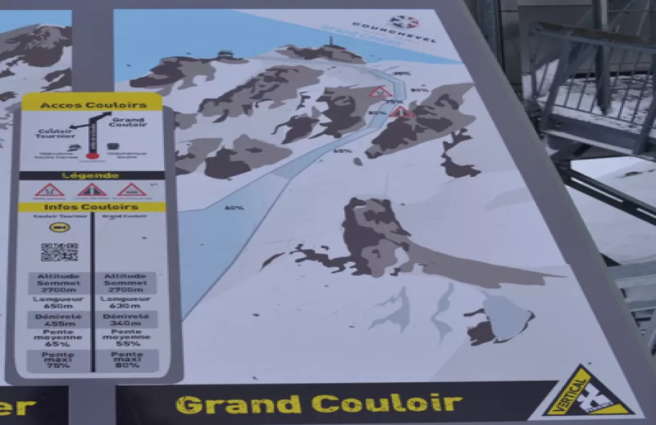 La pista nera Grand Couloir di Courchevel è la più ripida d'Europa. Con la sua pendenza massima dell' 80% e una pendenza media del 55% supera anche altre piste dell'arco alpino famose per la loro difficoltà. Al contrario di altri tracciati con pendenze simili come l'Harakiri di Mayrhofen che raggiunge "solo" il 76%, la nera di Courchevel non è battuta dai gatti ma dagli sciatori stessi che la percorrono ed è segnalata e delimitata dagli appositi bastoni.