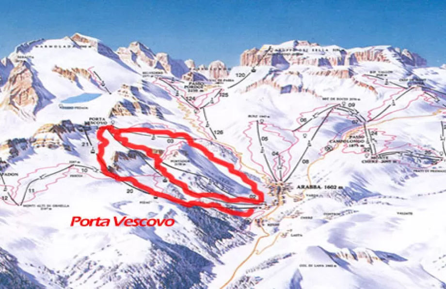 A Porta Vescovo il panorama è davvero mozzafiato. Alle tue spalle la Marmolada mentre davanti a te ecco le piste di Arabba e il Sella. La prima parte della pista è un muro, piuttosto largo, ma molto affollato. Si formano ben presto alte gobbe a causa del consistente numero di sciatori che percorrono la pista. Alla fine del muro si divide in due rosse, Ornella e Salere. Sono entrambe molto belle, varrebbe la pena di percorrerle entrambe. La pista Ornella è quella che vira verso destra. Riduce la sua pendenza e passa sotto i Roccioni di Porta Europa. Gira tra alcuni massi e la pietraia e si dirige verso l'intermedio della telecabina Porta Europa. Lascia la stazione intermedia sulla sinistra e continua a scendere. Su questo tratto l'affollamento è molto scarso e ti puoi divertire alla grande, con muri piuttosto lunghi e impegnativi. Alla tua destra trovi una variante nera che si incrocerà nuovamente con la pista Ornella e che permetterà anche il raccordo con la pista Sourasas. Personalmente io terrei la destra ad ogni bivio, questo è il tracciato che preferisco. Le piante, prima molto rade, ora sono diventate un fitto bosco di conifere. Non manca ancora molto, stai per arrivare ad Arabba dopo un dislivello di 870 m. Se vuoi puoi prendere indifferentemente il Funifor o la Telecabina Posta Europa e tornare in quota per provare le piste sull'altro lato della montagna. Ripercorri quindi il primo muro (percorso obbligato) e poi gira a sinistra. Imponenti roccioni sono sopra di te, alla tua sinistra. Poche decine di metri ed ecco il primo bivio. La pista nera n.3 Fodoma inizia alla tua destra. Poco affollata ma molto veloce, è particolarmente adatta a chi si vuole divertire con qualche brivido. La pista rossa n.1 Salere è invece più tranquilla e più affollata perché inserita nel percorso della Sellaronda. La percorrono gli sciatori che da Arabba si dirigono verso il Passo Pordoi e Canazei. Gli sciatori provenienti da Canazei scendono invece verso la pista facile Pordoi sino al paese di Arabba. Da Arabba si può salire con il funifor oppure con la telecabina DMC Porta Europa. All'uscita del secondo impianto vi sono un centinaio di metri di falsopiano prima di arrivare a Porta Vescovo.