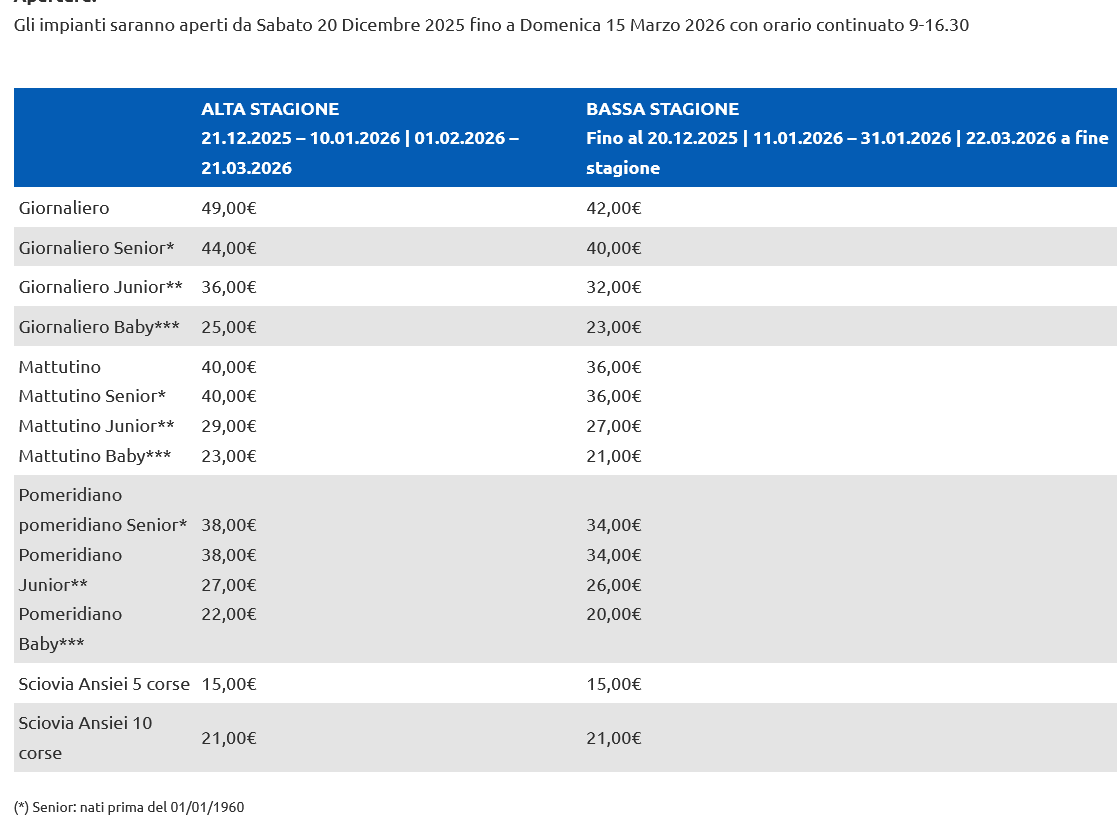 LISTINO PREZZI SKIPASS AURONZO DI CADORE - MONTE AGUDO 2025 - 2026