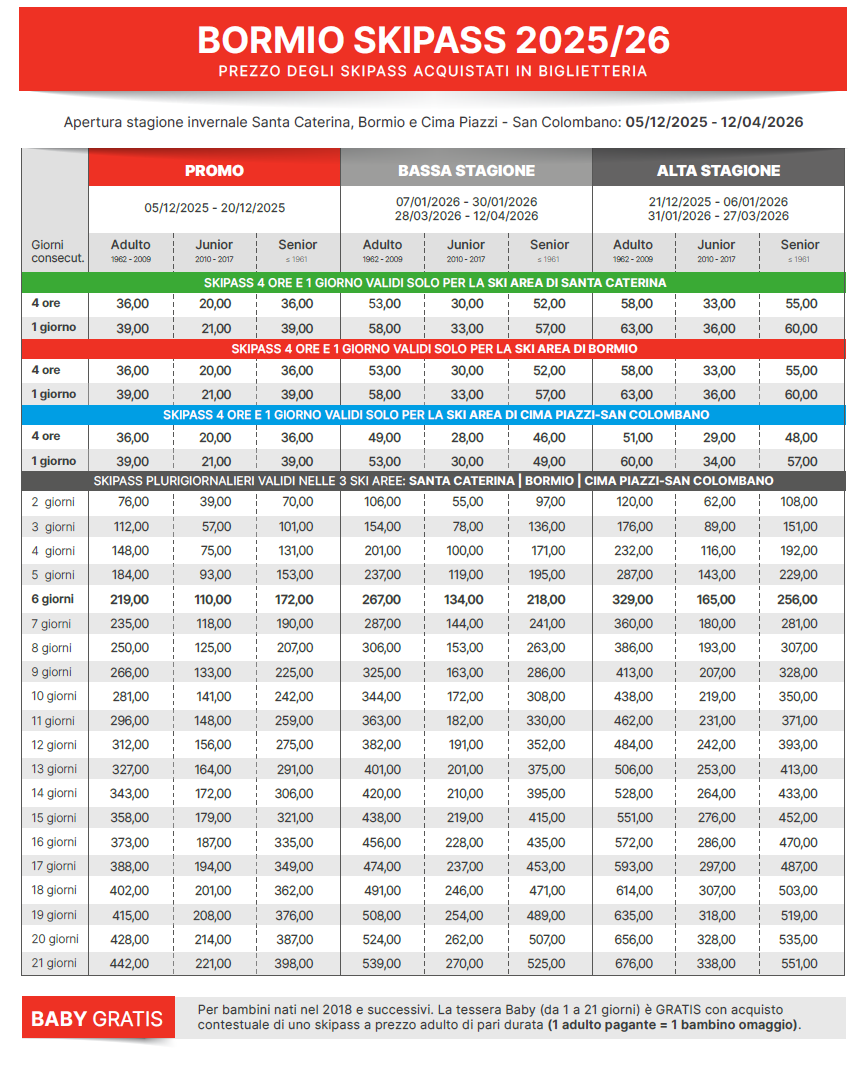 LISTINO PREZZI SKIPASS BORMIO 2025 - 2026