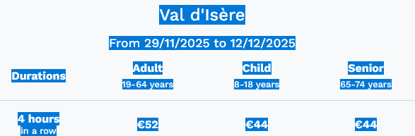 LISTINO PREZZI SKIPASS ESPACE KILLY - VAL D'ISERE  2025 - 2026