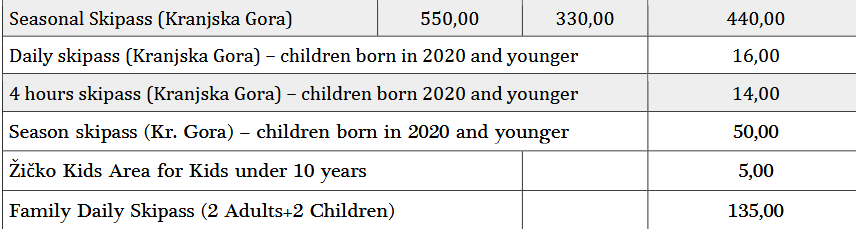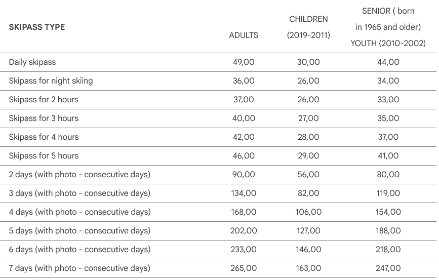 LISTINO PREZZI SKIPASS KRANJSKA GORA 2025 - 2026