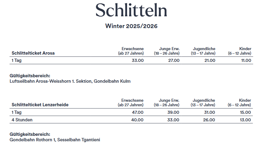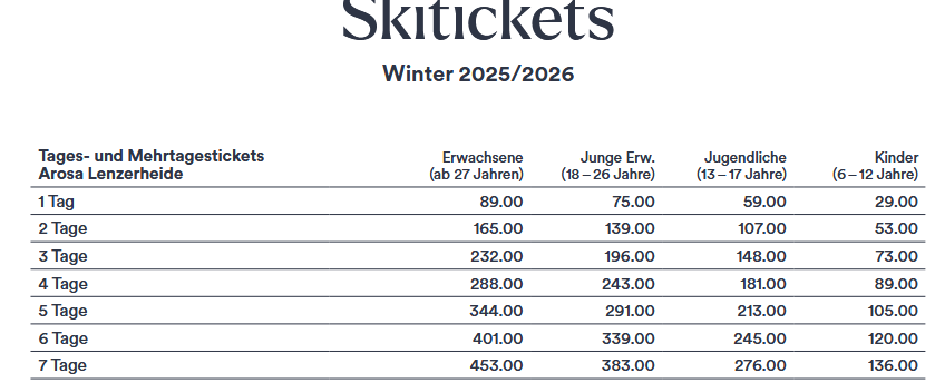 LISTINO PREZZI SKIPASS AROSA LENZERHEIDE 2025 - 2026 prezzi in CHF