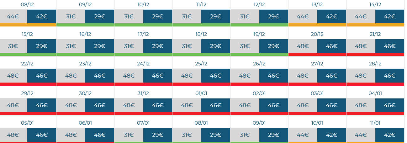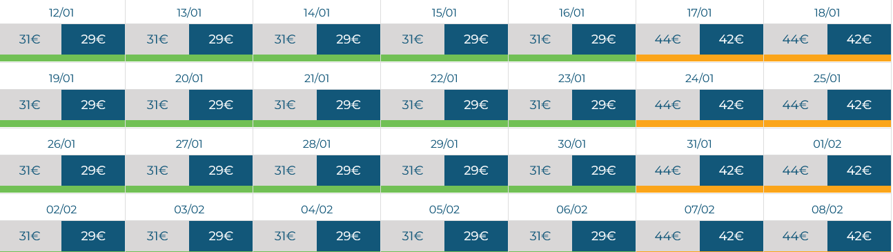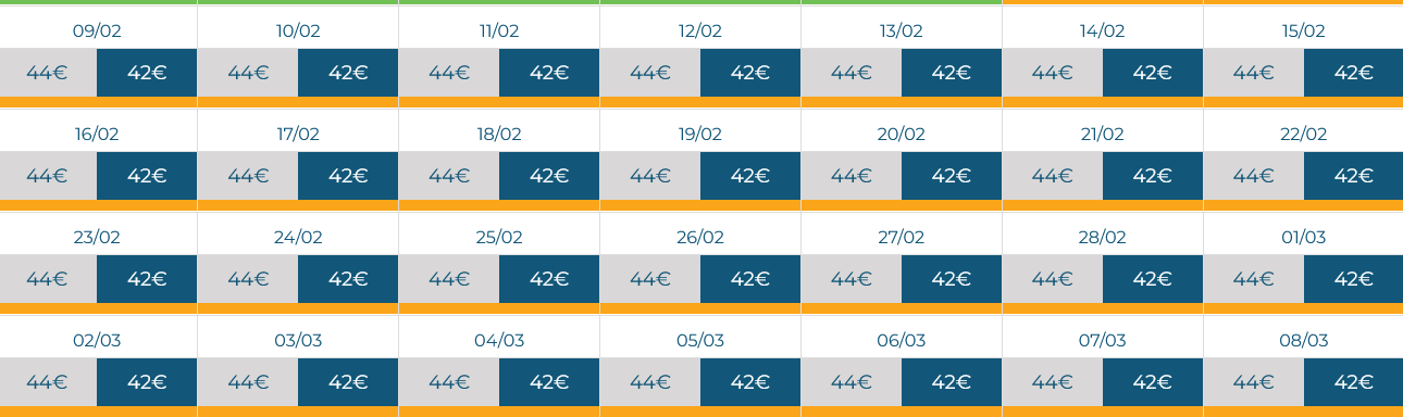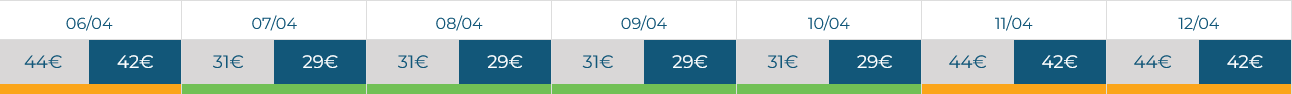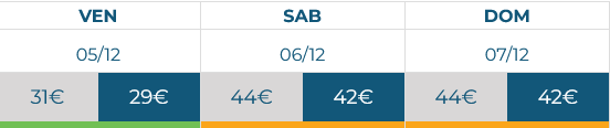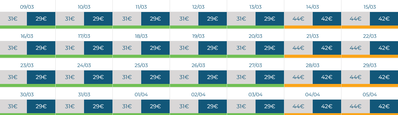 23 Mar 29.00€ compra | 24 Mar 29.00€ compra | 25 Mar 29.00€ compra | 26 Mar 29.00€ compra | 27 Mar 29.00€ compra | 28 Mar 42.00€ compra | 29 Mar 42.00€ compra |
