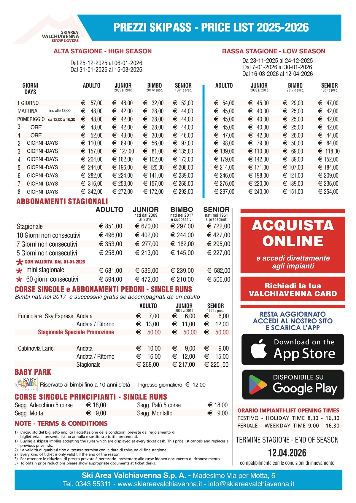 LISTINO PREZZI SKIPASS MADESIMO - VALCHIAVENNA 2025 - 2026