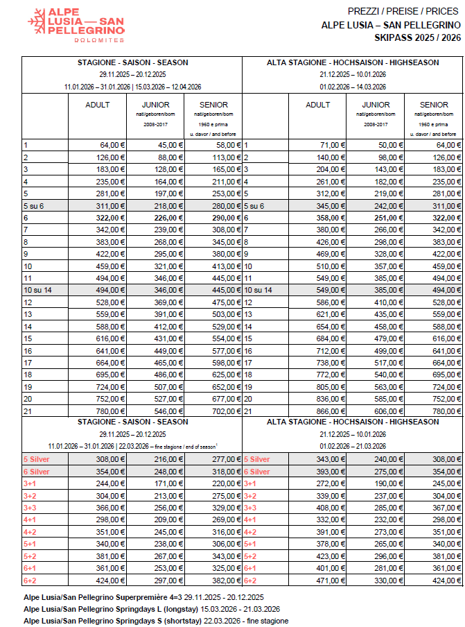 PREZZI SKIPASS MOENA - ALPE LUSIA 2025 - 2026