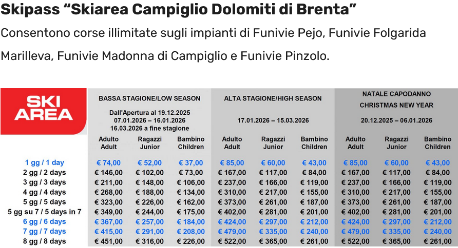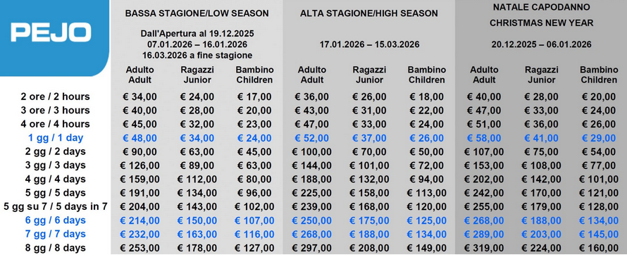 LISTINO PREZZI SKIPASS PEJO 2025 - 2026